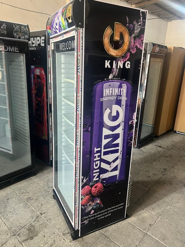 یخچال ویترینی ایستاده عرض 70 سانت طرح نوشیدنی انرژی زا king کینگ بنفش
